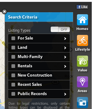 So, the search results will include all the checked types, but not the unchecked or grayed out kinds of properties below those For Sale. Land is not lit up yet, and not Multi-Family, or Rentals. So, those other kinds won’t appear.