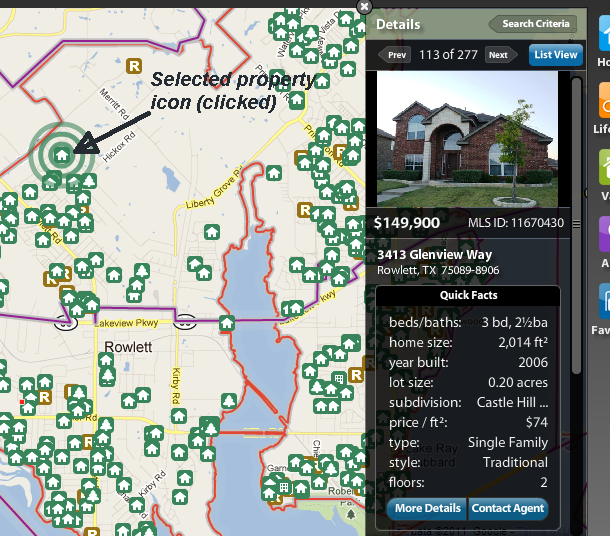 By clicking the List View button in the upper right corner of the detail panel you’ll get a list of all properties on the map. The corresponding property with the radiating circles will light up on the list.