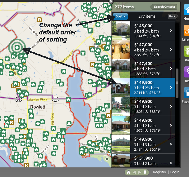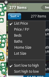 The drop-down list of sort options allows you to sort the properties on the list by various values. Sorting by price is the default, but you can pick Price/Square Foot to see which properties give you the most value per living space.