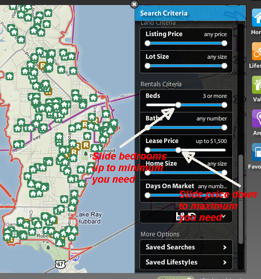 Here under For Sale we see the number of bedrooms, number of bathrooms, price and so on are settable criteria using the sliders. Just grab the white end and move it. A number will appear as you move it. The left white dot is the minimum and the right white dot is the maximum.