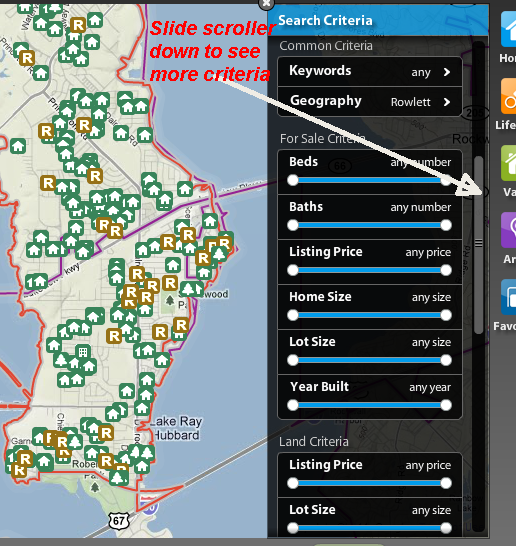 Just to the right of the criteria categories is a vertical scroller. To see more options grab the scroller and pull it down or up. If you have selected multiple property types, like For Sale, For Rent and so on, you’ll see any criteria that are common among them first, and then in each section the individual settings you can make.