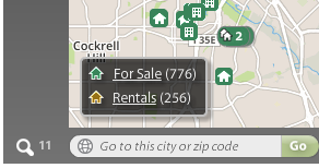 If we uncheck a type, like House, we’ll see the count drop immediately and the icons disappear off the map at the same time. You don’t have to hit a SEARCH button. There isn’t one.